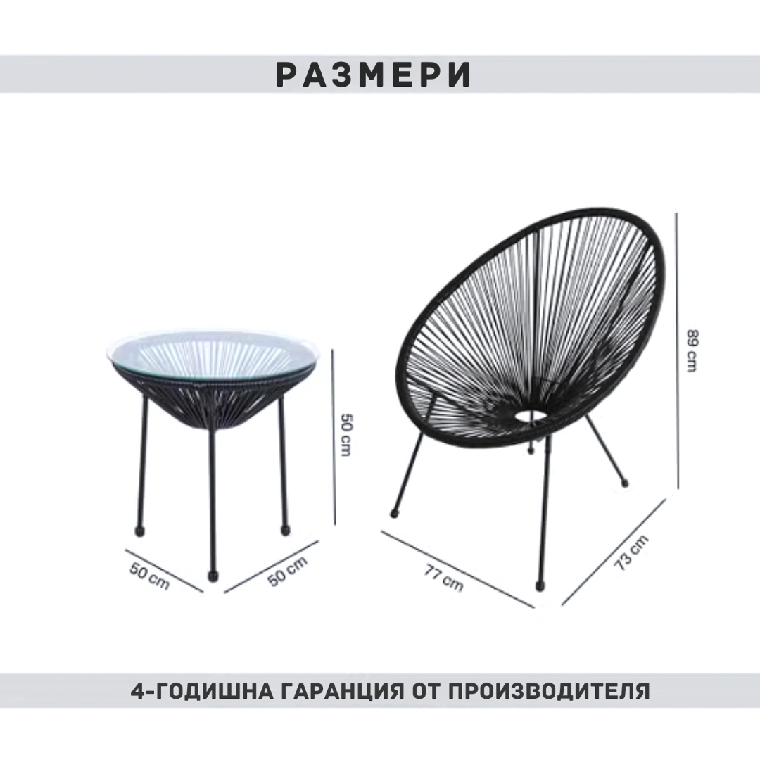 Комплектът включва две елегантни кръгли кресла и компактна масичка. Черната конструкция и геометричните линии придават изтънчен и модерен вид, който лесно се съчетава с различни стилове на обзавеждане.