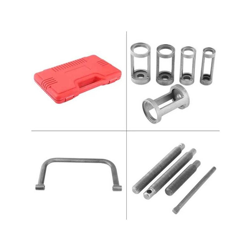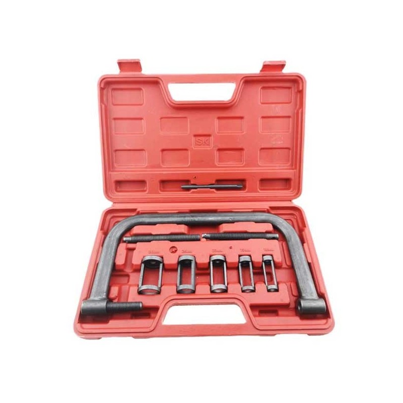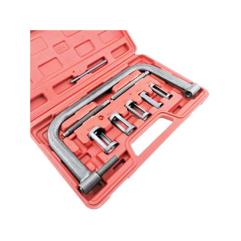 Универсален комплект, чрез който можете лесно и бързо без усилие да поставите пружините на клапаните, той улеснява тяхното свиване без усилия. Комплектът е подходящ за всички видове превозни средства като: автомобили, джипове и повечето двигатели на мотоциклети. Той съдържа 5 адаптера, което го прави изключително търсен от всички авто сервизи, тъй като ще премахне и свие пружините на повечето цилиндрови глави. Скобите се използват при свалена цилиндрова глава.