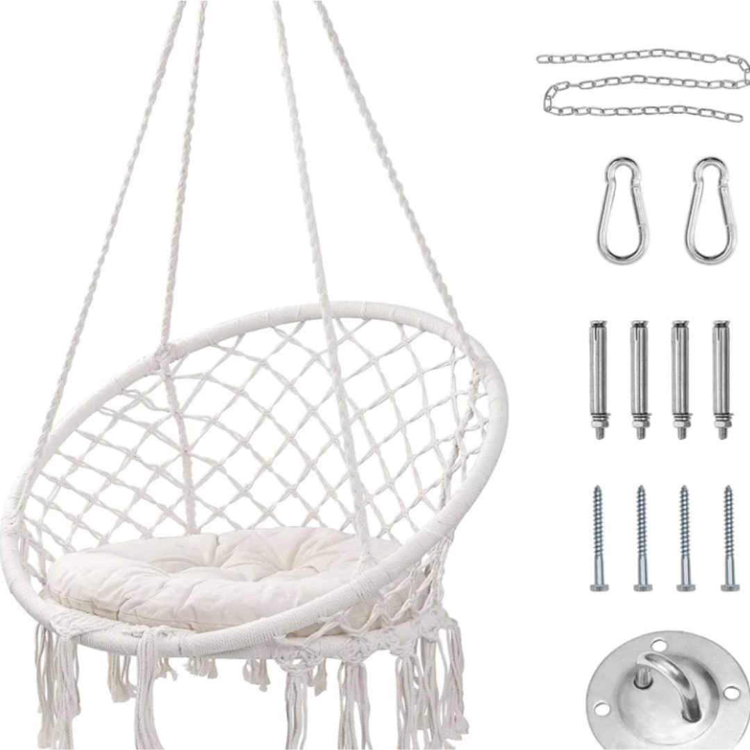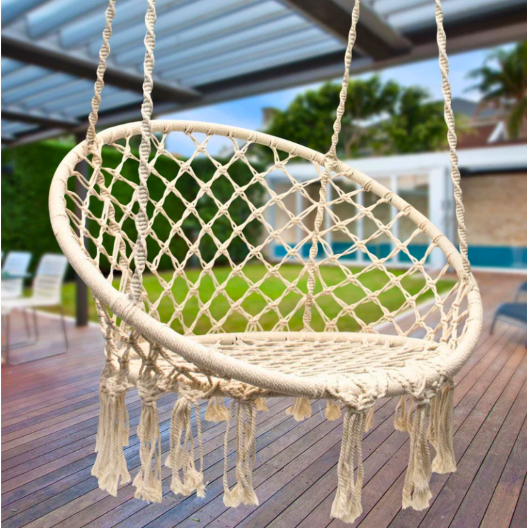 Висящата плетена люлка е стилно и удобно допълнение към вашия интериор или външно пространство. Изработена е с внимание към детайлите от високачествен памук и метална конструкция, за да осигури комфорт и издръжливост до 150кг.
