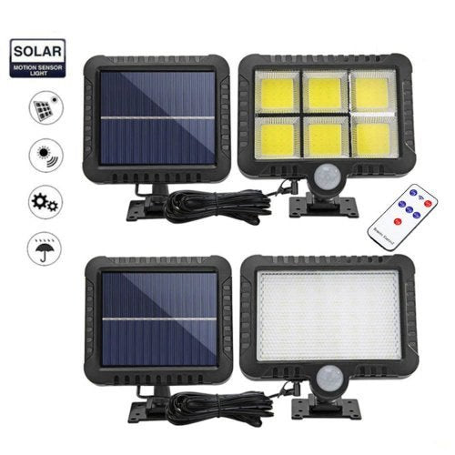 Мощна соларна LED лампа със 120 COB диода и сензор за движение. С отделен соларен панел и кабел 5 метра. С отделния соларен панел и кабел, тази лампа е изключително подходяща за монтиране на места където няма пряка слънчева светлина. Самата лампа може да се използва и в закрити не осветени помещения. Подходяща за монтиране под козирка.