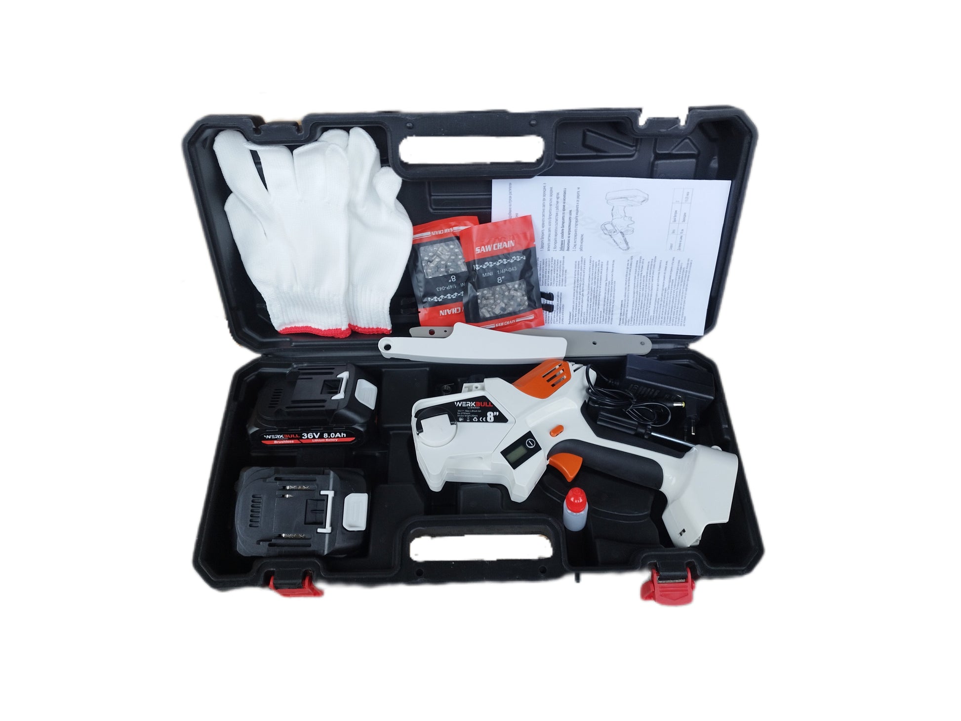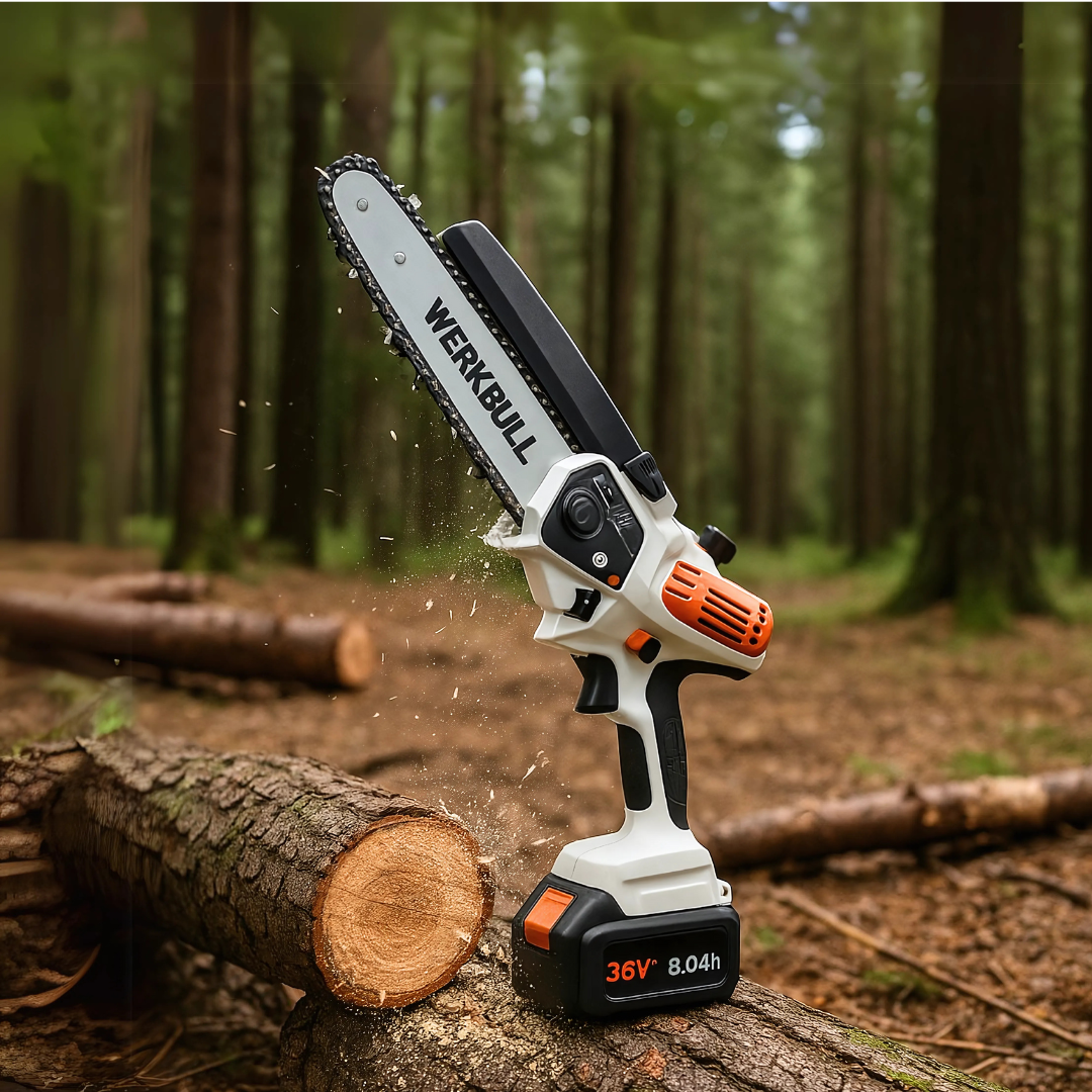 Новият немски акумулаторен верижен трион WerkBull e захранван с мощна батерия от 36v, която издържа до 360 рязания преди да се зареди отново. Той е високоефективен и с ниско ниво на шум при работа. За разлика от другите марки и модели, нашата резачка е изцяло фокусирана в предпазването на клиентите ни при работа, затова има предпазител с дължина 15см с цел максималната им безопасност. Меката ръкохватка предпазва от приплъзване. Мотърът и е безчеткова, което предполага по-дълъг период на активност. Има регулируемо автоматично смазване на веригата, както и индикатор за нивото на маслото в резервоара. Веригата се настройва и опъва безпроблемно и не е необходимо да разполагате с инструмент. Спирачката се активира с помощта на предния предпазител за ръката.