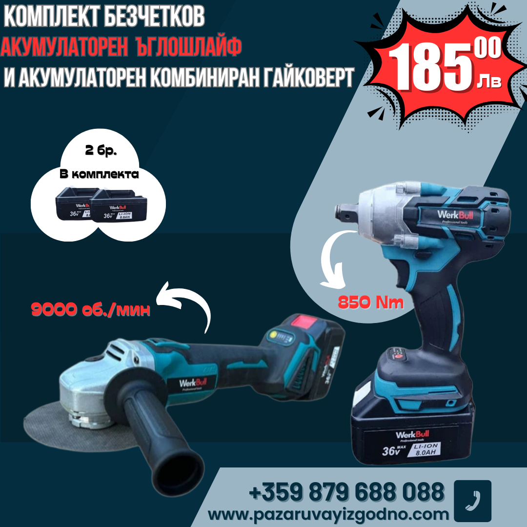 Немски 2в1 Комбиниран Ударен Акумулаторен Гайковерт и Безчетков Ъглошлайф 36V 10Ah
