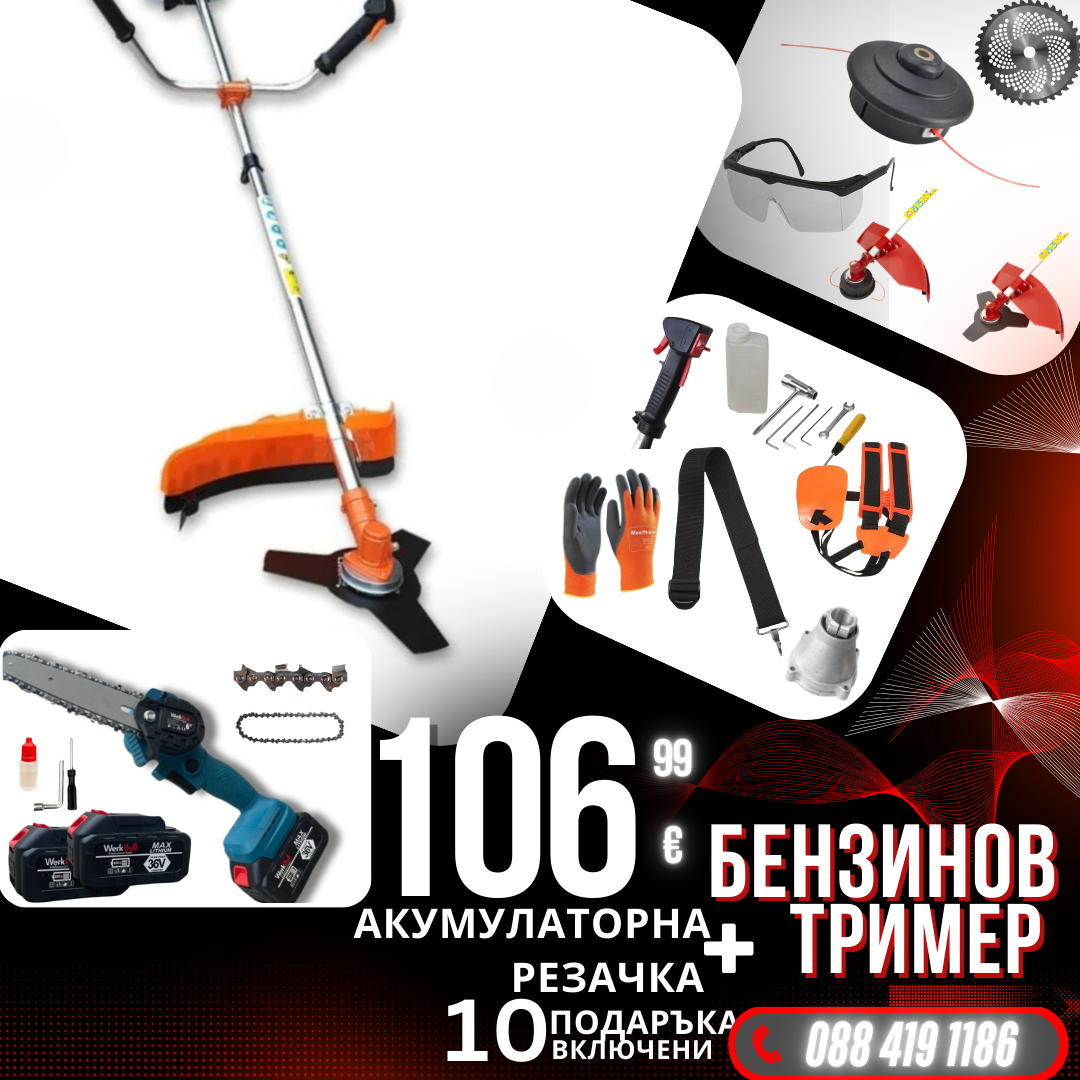 Немски Бензинов Тример за трева WerkBull с 10 подаръка + Мини Резачка за клони WerkBull с две батерии