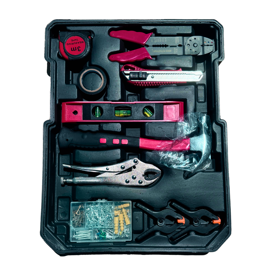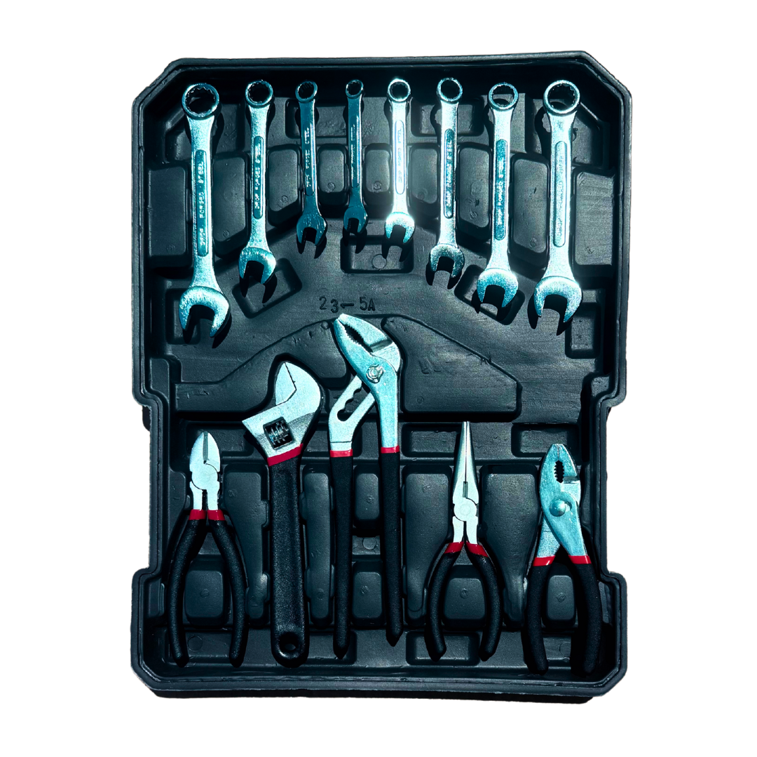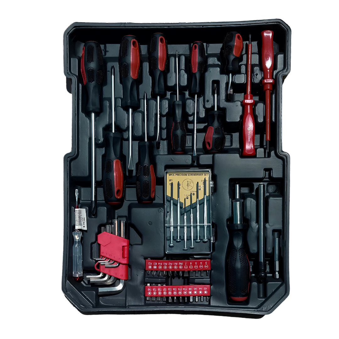 Сред инструментите ще откриете отвертки, френски ключове, клещи, макетни ножове, шестограми и много други инструменти, разпределени на четири нива.